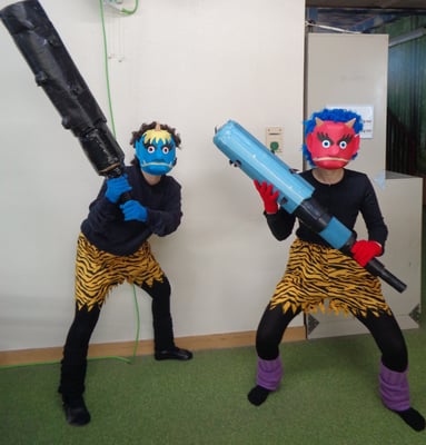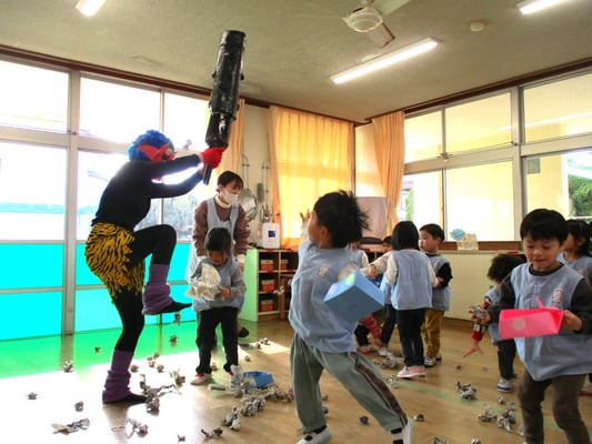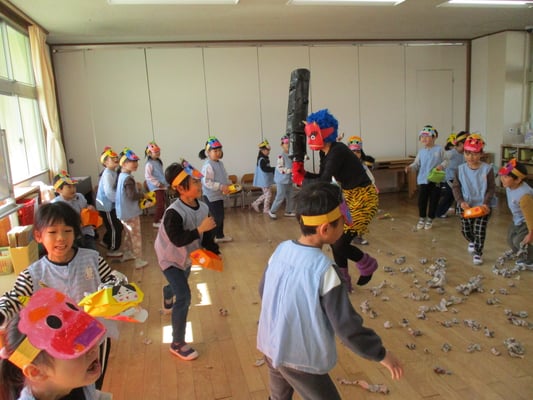 部屋に入って来た鬼に、新聞紙で作った豆を投げると、